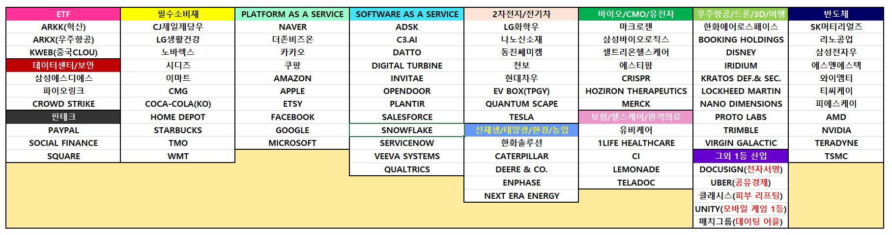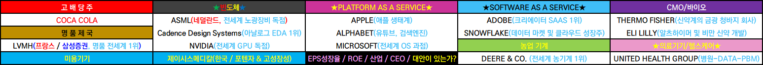 제가 인턴생활을 했던 자문사에서 실전으로 배운 것들, 그리고 공부 경험을 바탕으로 기업의 가치평가, 시장분석(대중 심리 분석), 그리고 위험 관리의 중요성을 많이 깨닫게 되면서 다음과 같은 기업들이 남게 된 거 같네요.