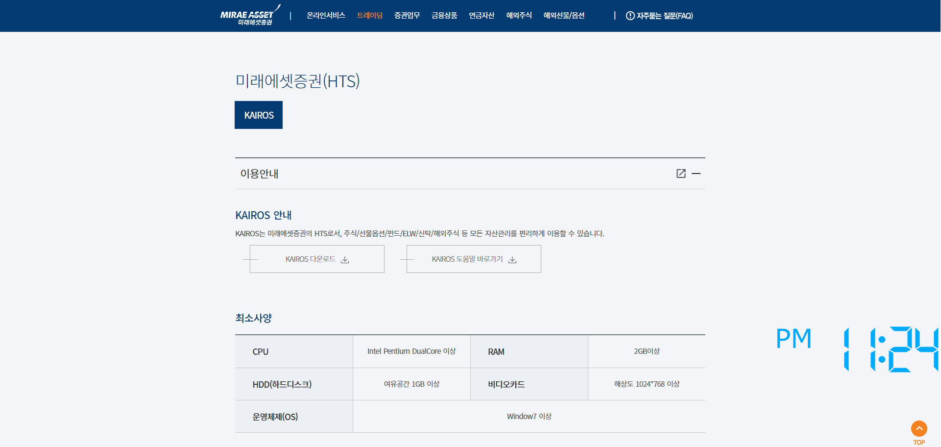 2. 미래에셋증권(HTS) 카이로스(KAIROS) '다운로드'란을 눌러 클릭하여 설치합니다.