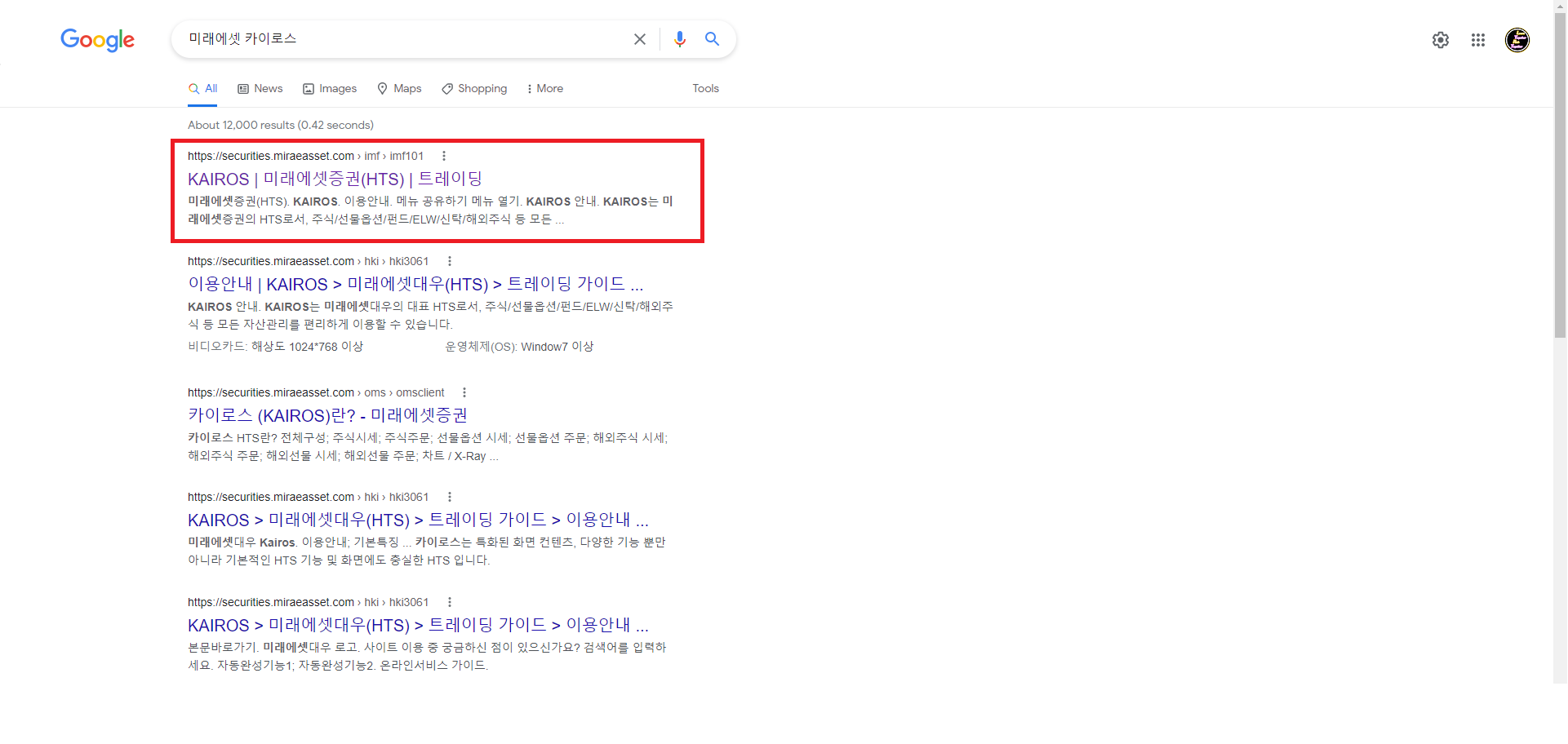 1. 구글 검색창에 '미래에셋 카이로스'를 검색하여, https://securities.miraeasset.com 링크에 접속합니다.