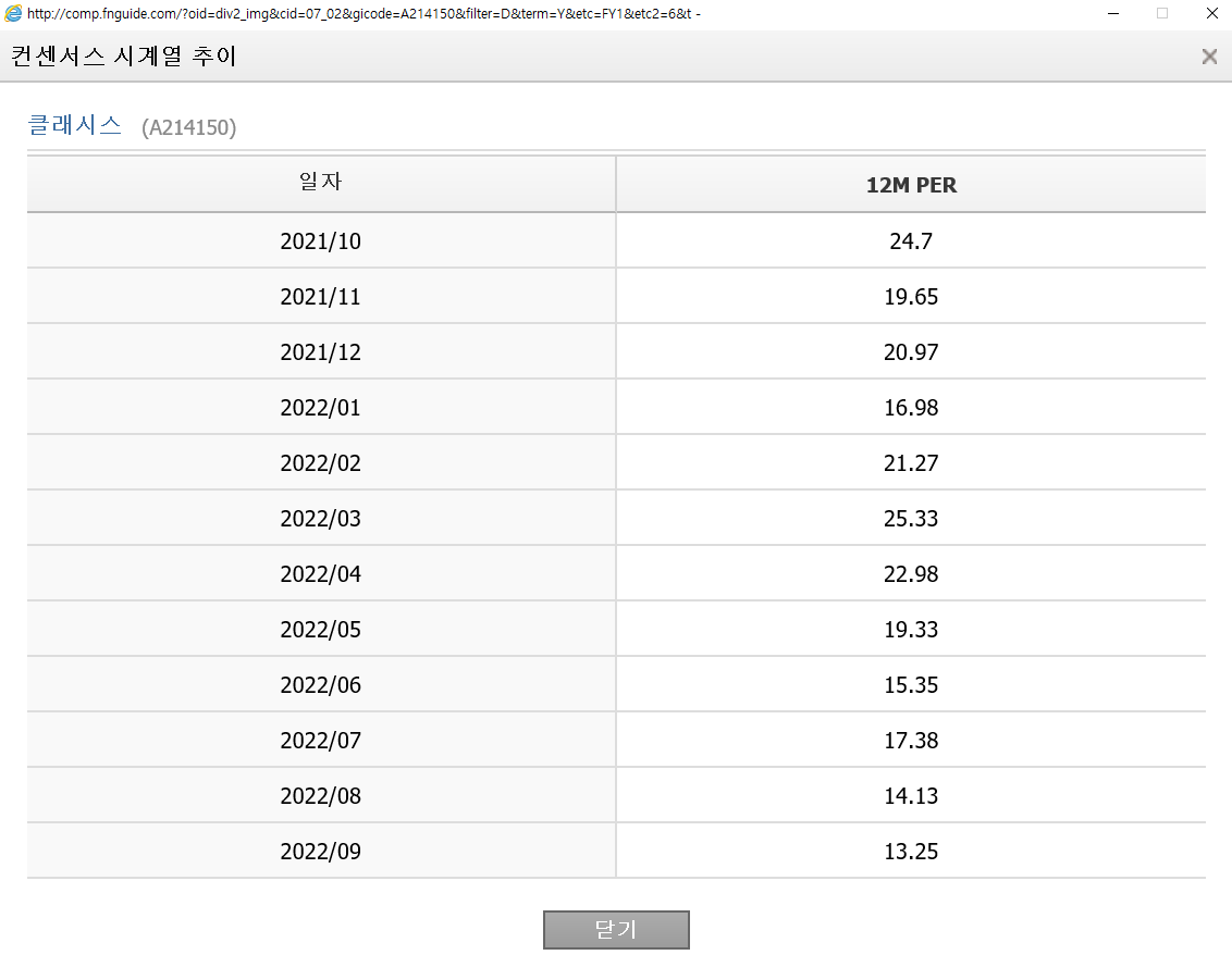 금일(2022.09.13, 추석 연휴 후 바로 다음날) 23시에 작성하고 있는 자료이기에 전일 종가로 처리되어, 오늘 종가인 클래시스의 13,950원은 반영이 안 된 데이터임을 반드시 인지해주시기 바랍니다.