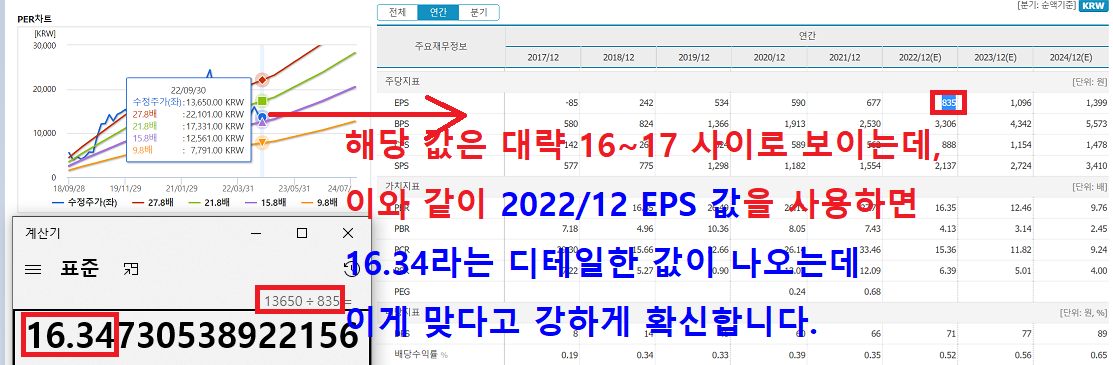 현재 시점이 2022.09.13이라면 저기에 환산되는 값은 2022년 01월 01일~2022년 12월 31일까지 산출한 2022/12 EPS 값을 말하는 것이라는 뜻입니다.