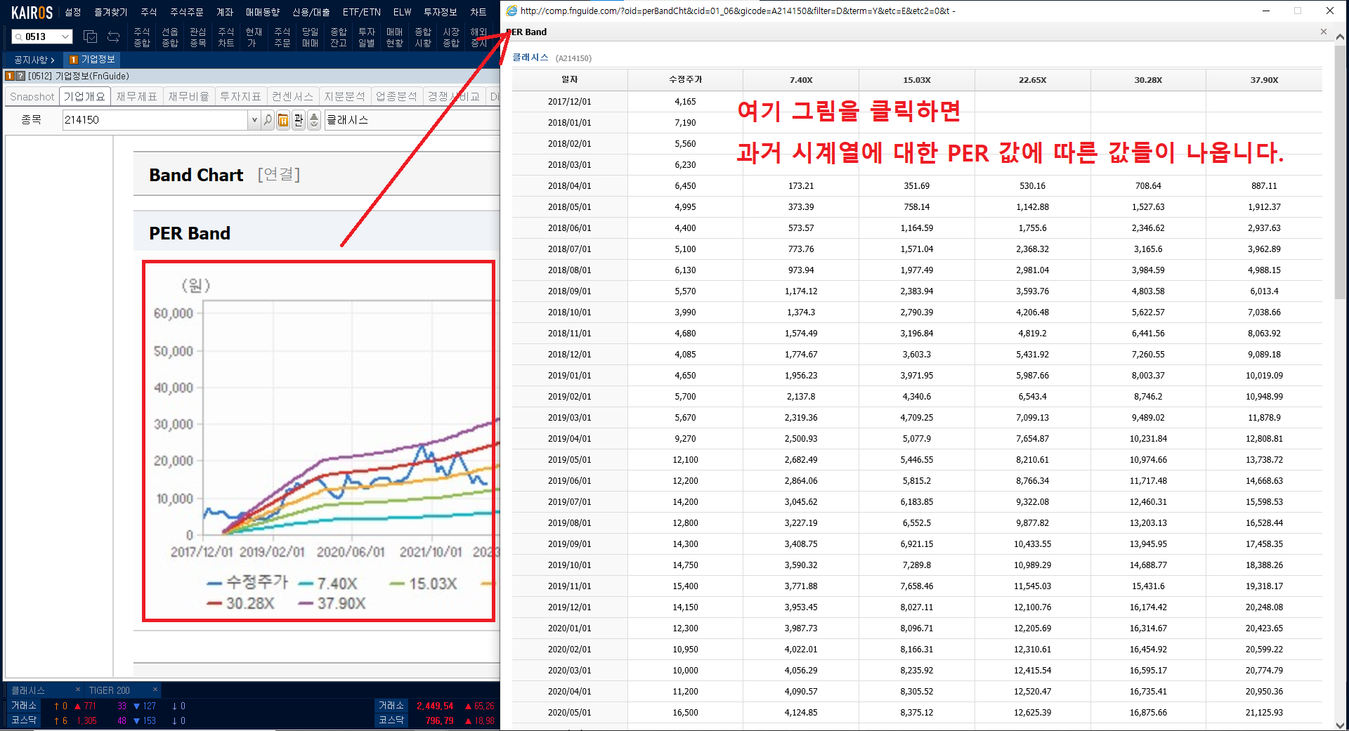 8. 기업정보[Fnguide] 창에서 '기업개요'를 클릭한 후, 밑의 PER Band에 도표를 클릭할 수 있을 겁니다. 이를 통해 과거 시계열로 들어갈 수도 있고, 과거에 내용들을 확인할 수도 있습니다.