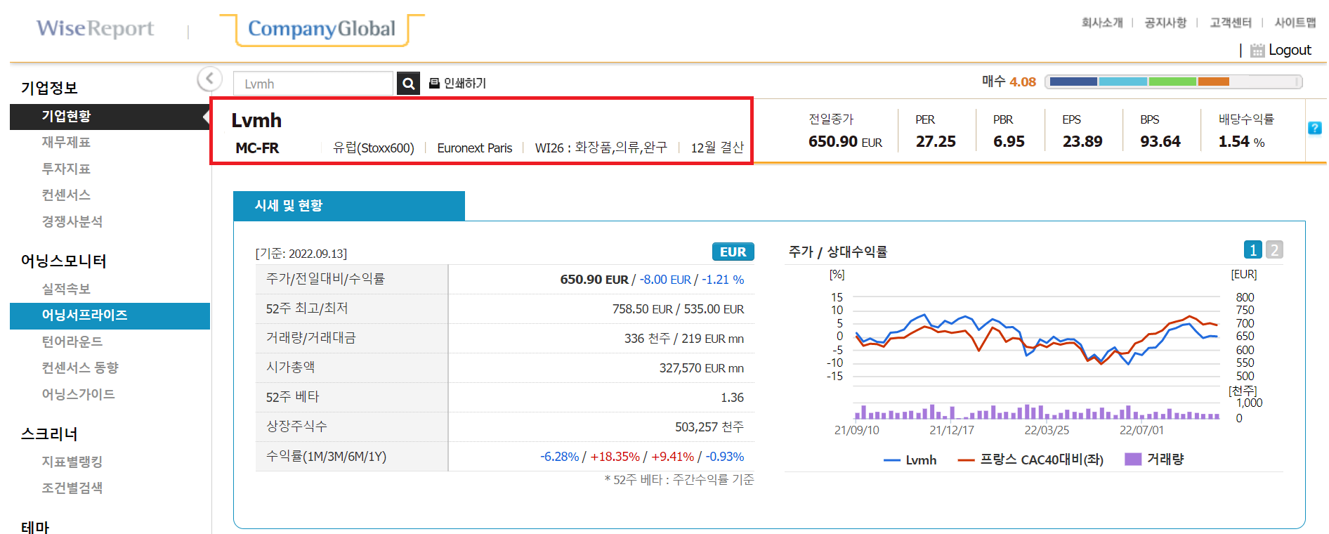 아래 내용은 2022.09.14 오전 10시 40분의 Wisreport의 Fwd.12M 화면입니다.