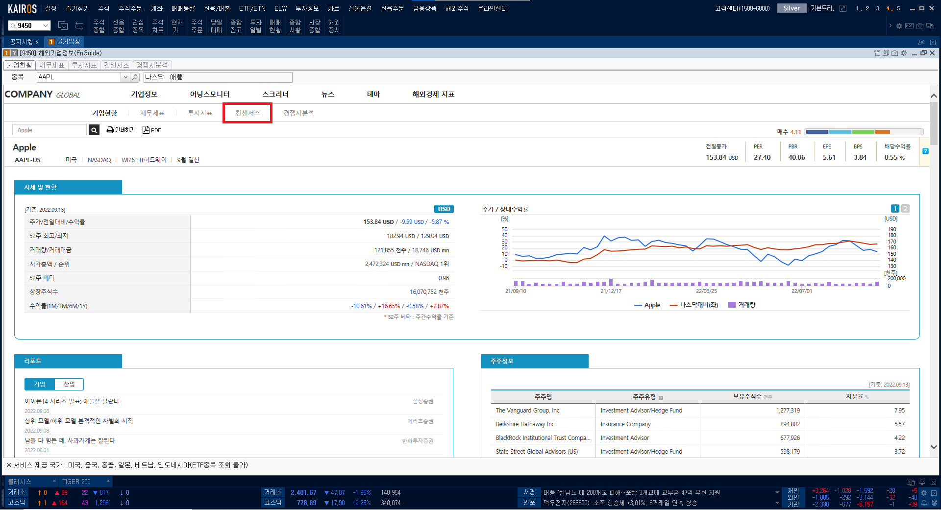 그러면 COMPANY GLOBAL이라는 이름의 사이트가 나오고, 보통 애플(티커 AAPL) 기업이 제일 먼저 기업정보로 나오게 될 겁니다. 그리고 이 내용은 증권사에서 사용하는 Wisereport와 동일합니다.