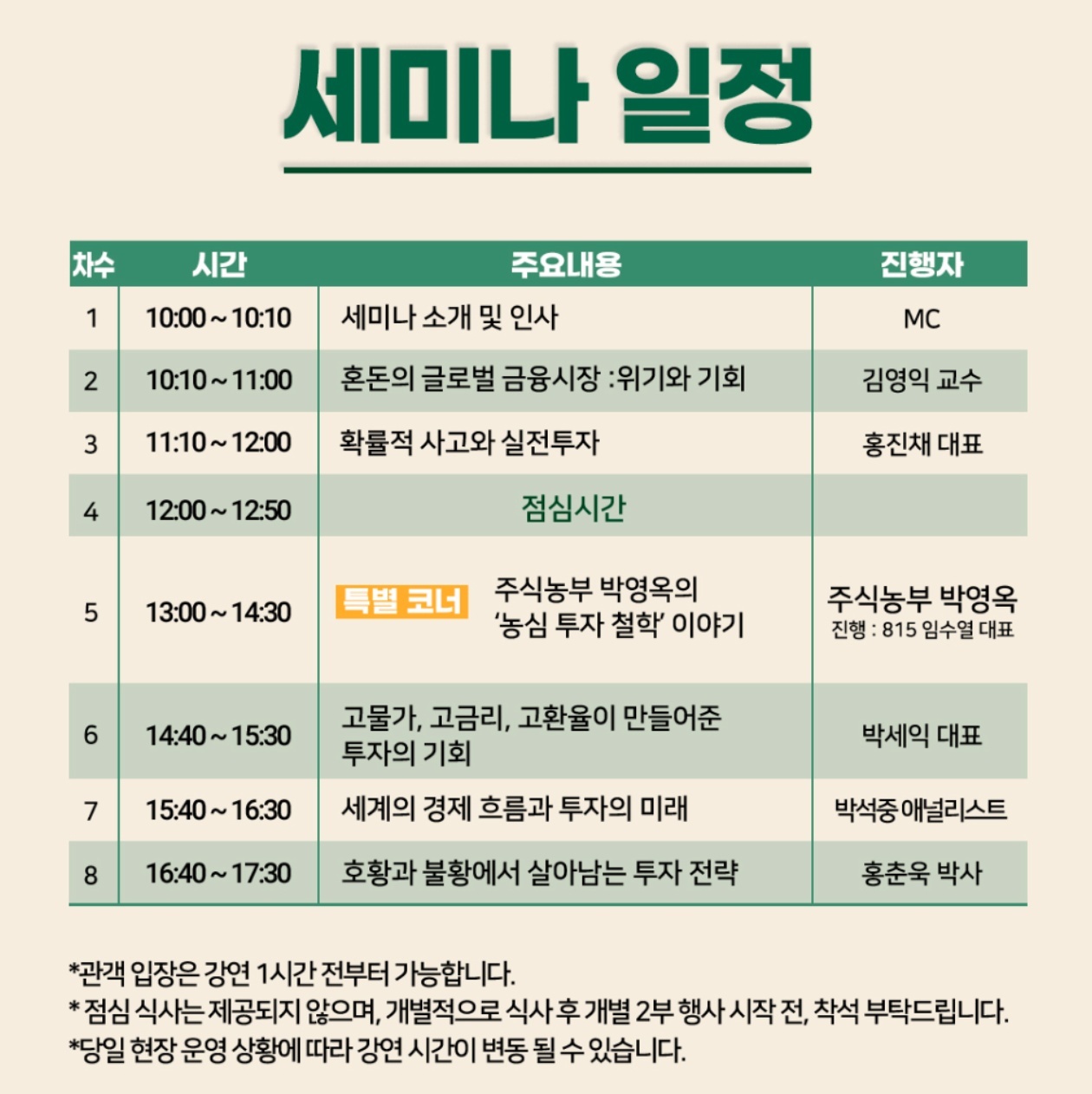 먼저 본 세미나를 위해 피와 땀을 갈아 코엑스에서 강의해주신 김영익 교수님, 홍진채대표님, 박영옥 회장님, 박세익 전무님, 박석중 연구원님, 그리고 홍춘욱 박사님께 감사의 말씀을 전합니다.