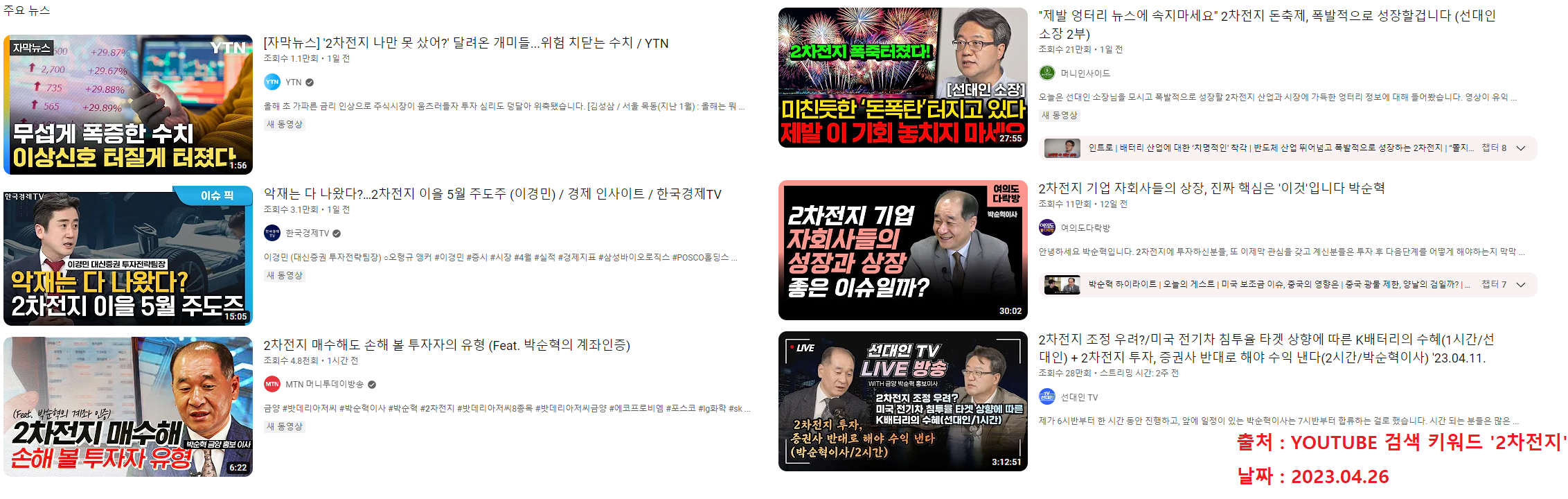 그리고 현시점에서 지속적으로 업로드되고 있는 2차 전지가 앞으로 시장을 계속 이끌고 갈 것이라는 유튜브 영상들.