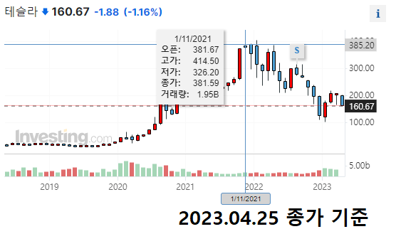 2년 전까지만 해도 종교를 형성할 정도로 무서운 기세를 보였고, 수많은 사람들이 '이번에는 다르다'를 외쳤던 미국 기업 테슬라가 그 대표적인 예시가 되겠습니다.