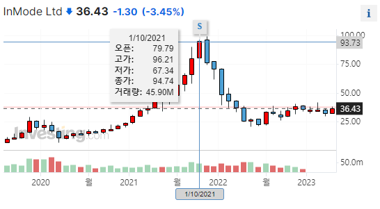 코로나 이전에도 꾸준히 돈을 잘 벌고 있던 기업인 INMODE의 경우에도 TESLA와 같은 맥락으로 주가 폭등이 이어졌으나, 2021년 약 96달러에 형성된 주가는 현재는 36달러 수준에 머무르고 있습니다.