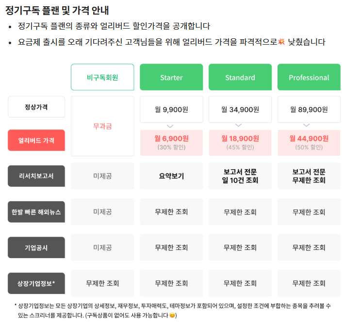 단, Starter 서비스는 리서치보고서를 '요약보기'만 할 수 있기에 애널리스트들의 깊이 있는 인사이트를 확인하기가 어렵습니다. Standard 밑의 서비스는 추천드리지 않으며, 무료로 증권사 레포트는 보고자 하시는 분들은 네이버 증권 or 한경컨센서스의 자료들을 이용하셨으면 좋겠습니다.