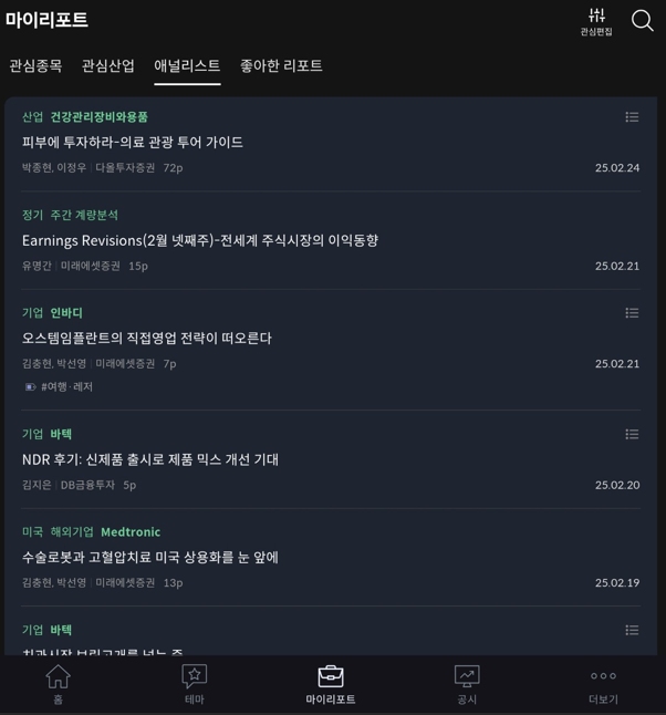 위 항목은 제가 관심있게 보고 있는 '건강관리 장비와 용품' 산업을 담당하는 애널리스트들의 2월 레포트들인데요.