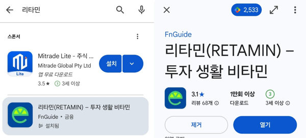 구글 플레이스토어에서 리타민을 검색하면, Fnguide(에프앤가이드) 사에서 만든 리타민(Retamin) 어플리케이션이 있을겁니다. 이를 설치해주시고 회원가입을 마친 후, 구독서비스를 신청하게 되면 아래와 같은 화면이 나오게 됩니다.