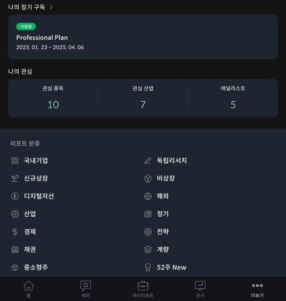 여기서, 하단 우측 '더보기' 탭을 클릭하시게 되면 개개인에 맞게 설정할 수 있는 관심 종목/관심 산업/관심 애널리스트들을 여러분들이 설정할 수 있게 됩니다.