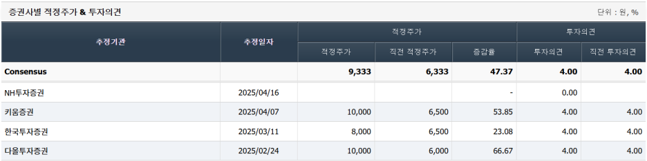 애널리스트들의 기업 실적 예상치를 과거와 비교해서 보더라도 많은 기대를 받았다가 실적이 꺾이면서 급락한 기업임을 알 수 있습니다. 3개월 전과 비교를 했을 때는 서서히 올라가면서 상승추세를 보이지만, 6개월 전과 1년 전을 2025년 04월 19일과 비교했을 때는 여전히 많은 차이가 나고 있음을 보여주고 있습니다.