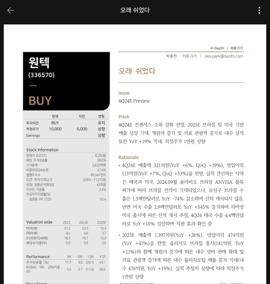 위 2개의 레포트는 2025년 02월 21일, 그리고 2025년 03월 11일 발간된 원텍 기업 분석 보고서입니다.