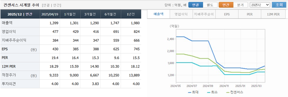 애널리스트들의 기업 실적 예상치를 과거와 비교해서 보더라도 많은 기대를 받았다가 실적이 꺾이면서 급락한 기업임을 알 수 있습니다. 3개월 전과 비교를 했을 때는 서서히 올라가면서 상승추세를 보이지만, 6개월 전과 1년 전을 2025년 04월 19일과 비교했을 때는 여전히 많은 차이가 나고 있음을 보여주고 있습니다.
