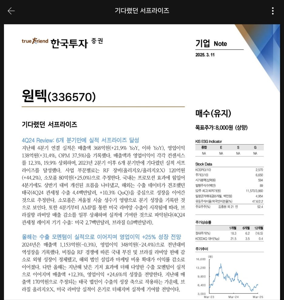 위 2개의 레포트는 2025년 02월 21일, 그리고 2025년 03월 11일 발간된 원텍 기업 분석 보고서입니다.